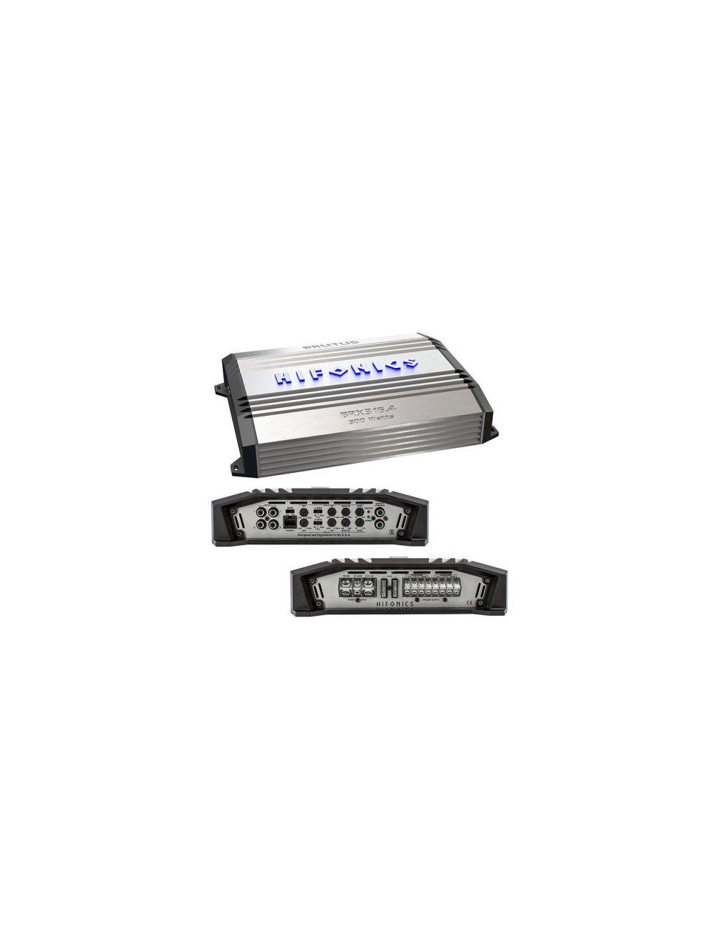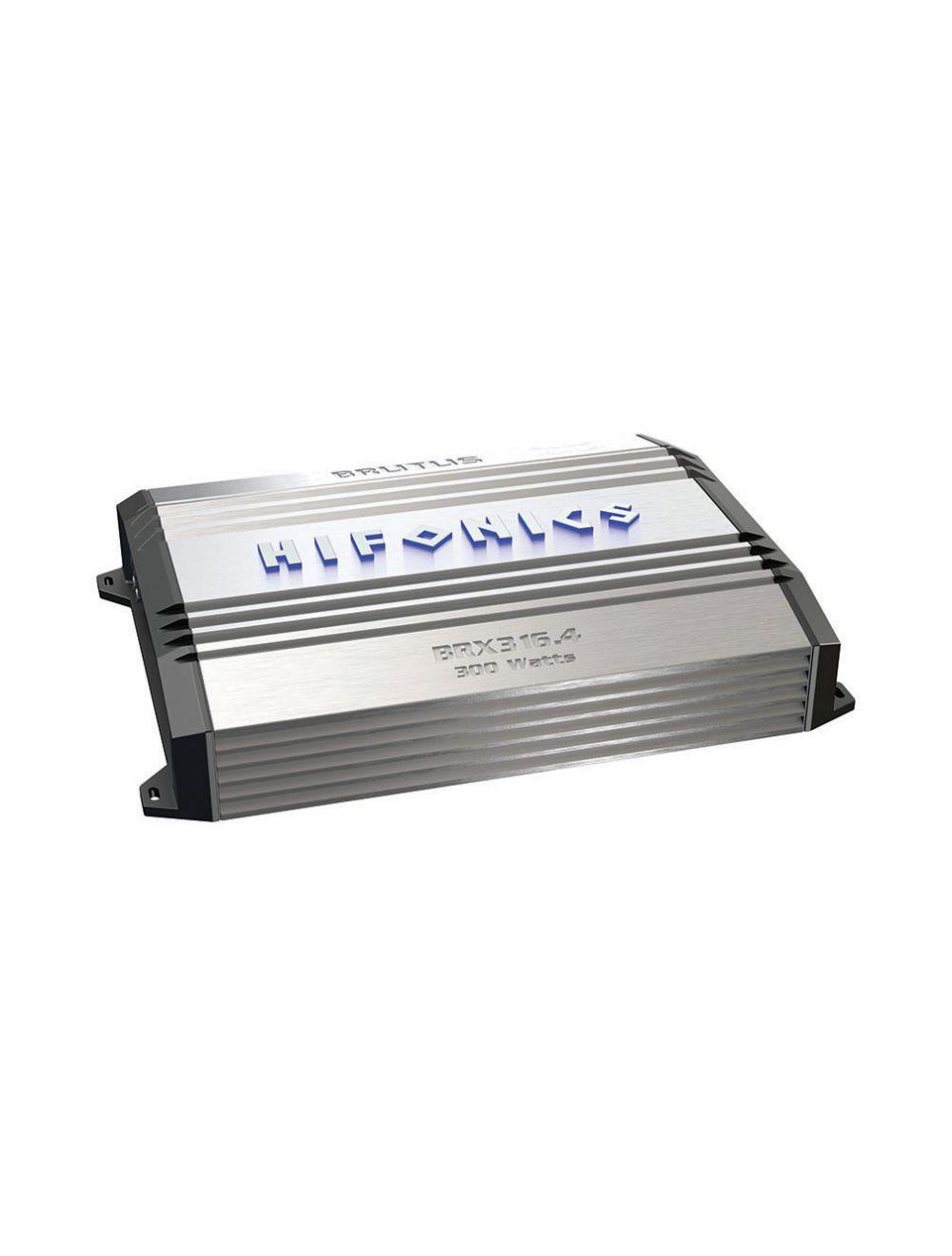 Hifonics 300 Watt 4 channel, bridgeable, Brutus Super A/B Class car audio amplifier. Features include an onboard electronic crossover with angled and illuminated terminals