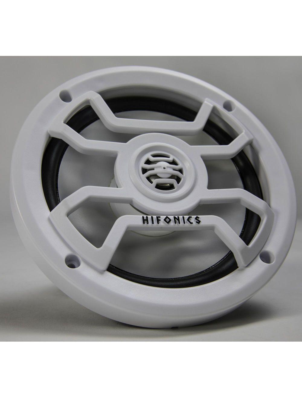 Hifonics marine certified, 6.5 inch coaxial marinespeaker for boat, RV and off-road vehicle audio installations. These speakers feature water resistant midrange cones, titanium tweeters and rust resistant connectors. Sold in pairs with grills in white.