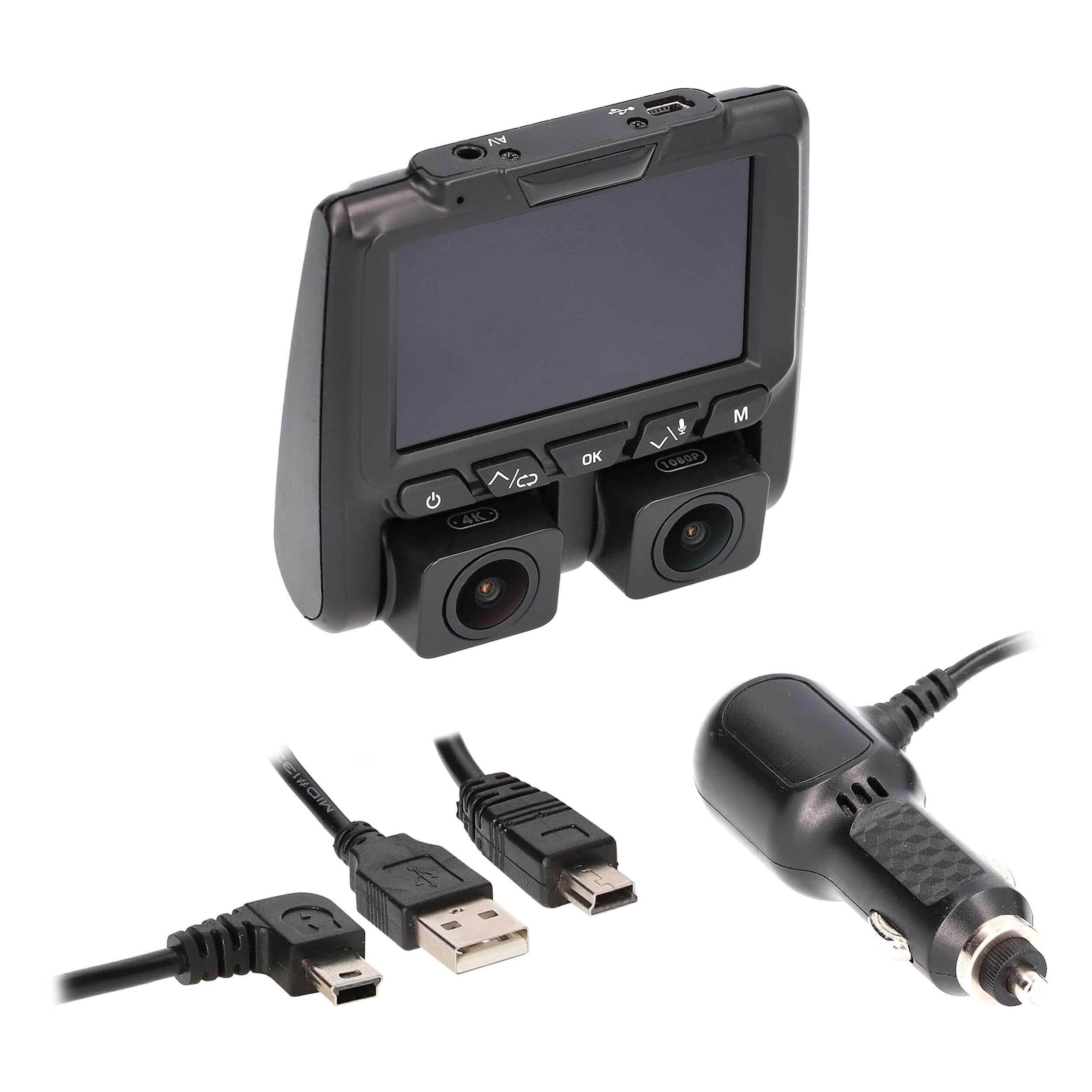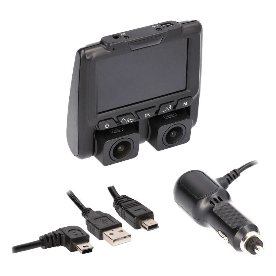 Quickly and easily mount this dual view camera on your windshield to view and record the area in front of and inside your vehicle. This high-resolution dual-view camera with DVR captures and displays a 140° wide-angle field of view to protect drivers from liability and increase safety. Each lens can be directed toward the front windshield to view what is ahead of the vehicle or toward the vehicle’s interior and out the rear window to capture the view directly behind the vehicle. Both angles can be displayed simultaneously on the built-in 3-inch viewing screen that sits atop the two camera lenses. This dash camera features 4K HD recording, including audio which can be stored on a micro memory card of up to 128 GB.
