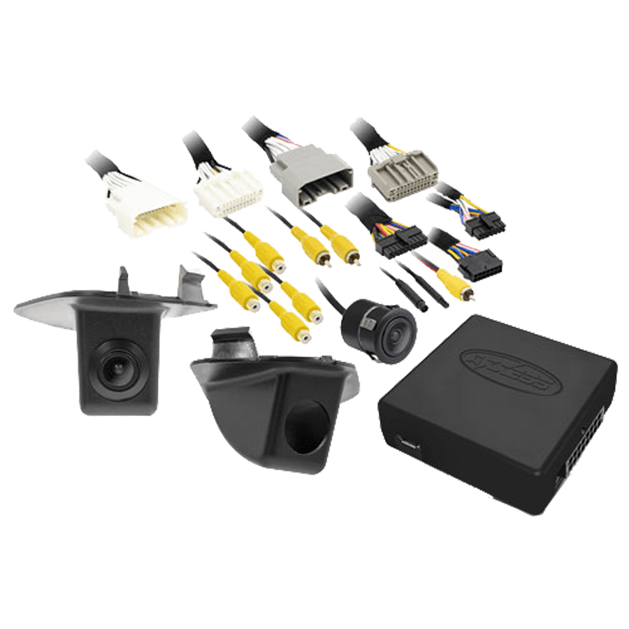 This camera kit includes two side mirror pods and cameras providing a 170-degree field of view and Axxess AX-ADDCAM interface and wiring. The AX-ADDCAM camera switching interface allows integration for up to four different cameras to function automatically for parking assistance with four CAN activated camera inputs to the factory radio.