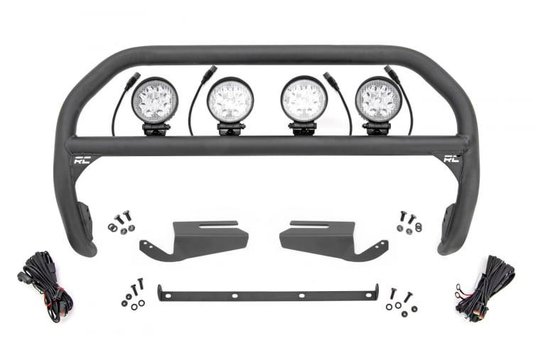 Durable Upgrade. Each Nudge Bar is coated with a corrosion-resistant black powder coat to ensure a long lifespan for years to come. Rough Country's Nudge Bar can be equipped with four round LED lights, or a single row 20" LED light bar! Rough Countrys all-weather LED lights feature a durable, die-cast aluminum housing and include a premium, waterproof, flat-wound, braided wiring harness with a toggle switch and in-line fuse.