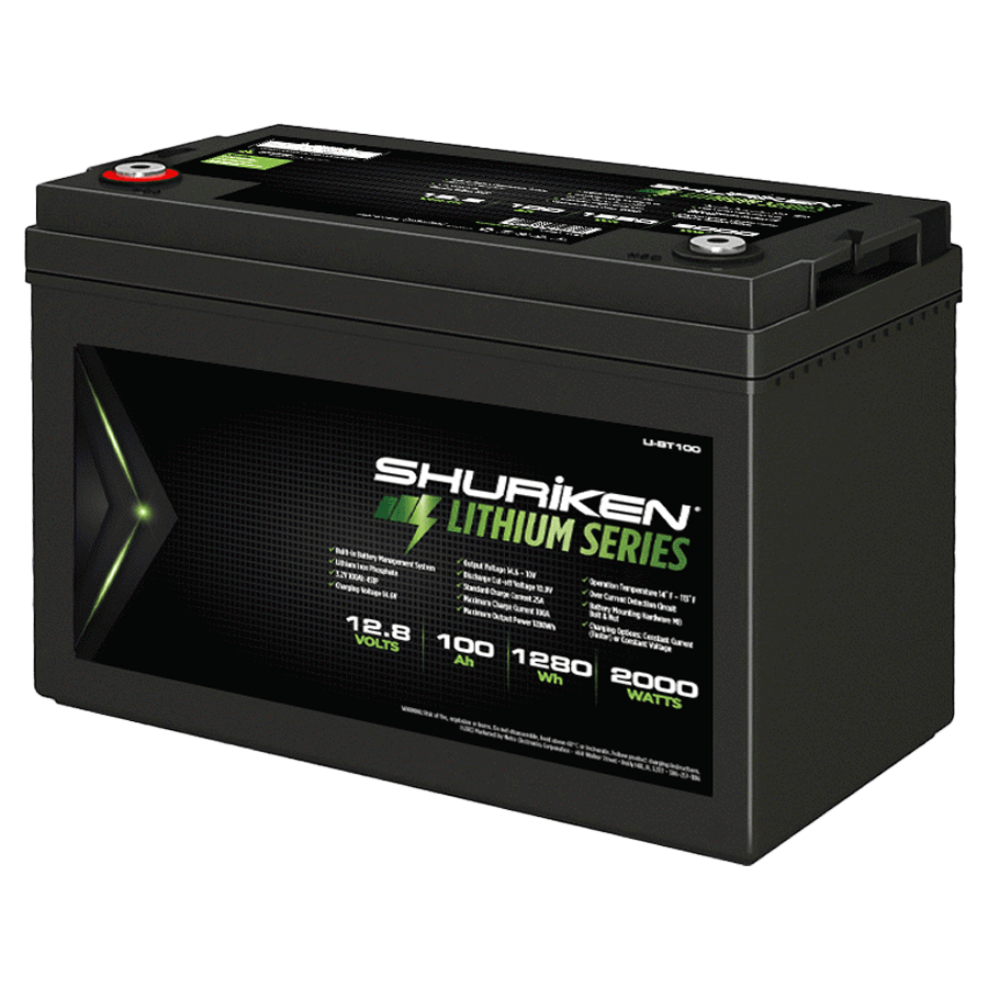 Shuriken Lithium Iron (LiFePO4) batteries are a great choice for situations where the power source needs to be lightweight and compact, with a quick energy discharge. These batteries weigh much less than other options while remaining long-lasting, reliable, and vibration-resistant. Internal components are sectioned into independent cells that make for a safer battery that is less likely to short out if damaged. This Shuriken Lithium Iron battery is perfect for providing reliable power for numerous applications, including stereo systems, RVs, marine, solar energy storage, and more. It is designed to recharge quickly and hold a charge longer than conventional batteries.